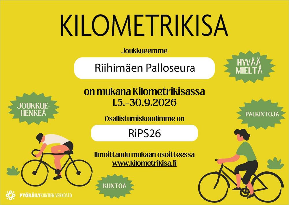 Riihimäen Palloseura osallistuu kesällä 2026 valtakunnalliseen Kilometrikisaan, joka käynnistyy 1.5.2026. Kutsumme mukaan kaikki seuran jäsenet, perheet sekä muut liikunnasta kiinnostuneet kerryttämään pyöräilykilometrejä yhteiseen pottiin.