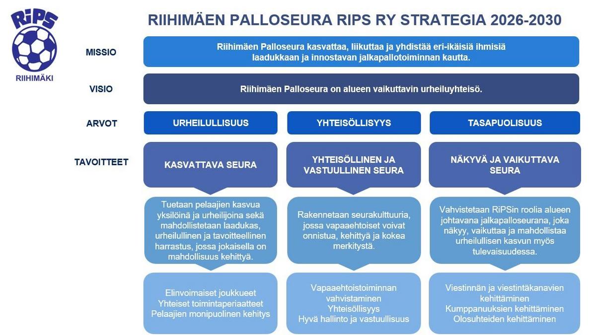 Vahvistamme RiPSin asemaa alueen johtavana jalkapalloseurana. Kehitämme viestintää, yhteistyötä ja varainhankintaa sekä toimimme aktiivisena ja luotettavana kumppanina paikallisessa yhteisössä.