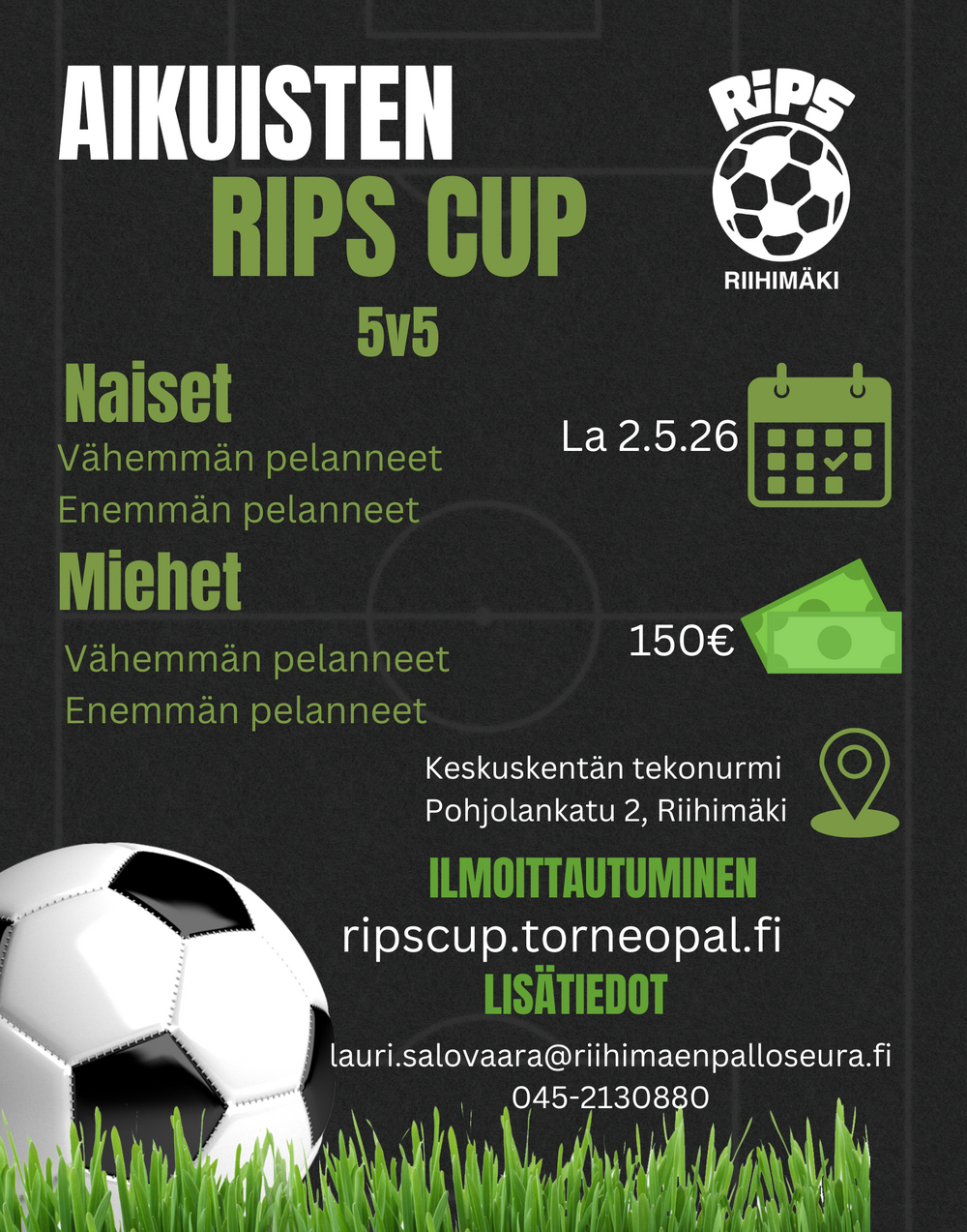 Aikuisten RiPS Cup -turnaus järjestetään lauantaina 2.5.26 Riihimäen tekonurmella (Pohjolankatu 2, 11120 Riihimäki).